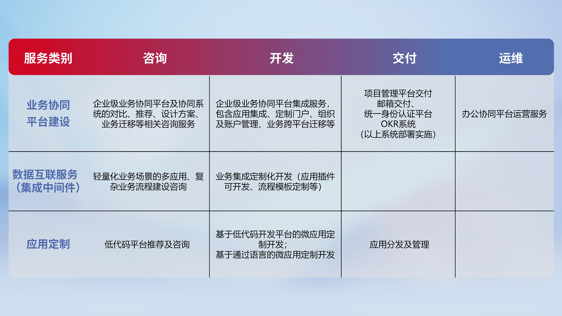 针对钉钉、、、、企微、、、、IDaas等平台级产品提供产品的规划、、方案、、交付、、、、定制化开发等服务,,,实现如统一协同办公、、智能客户服务、、、、混合会议管理、、、、智能数据查询、、、等业务场景,,实现数字化转型。。。。