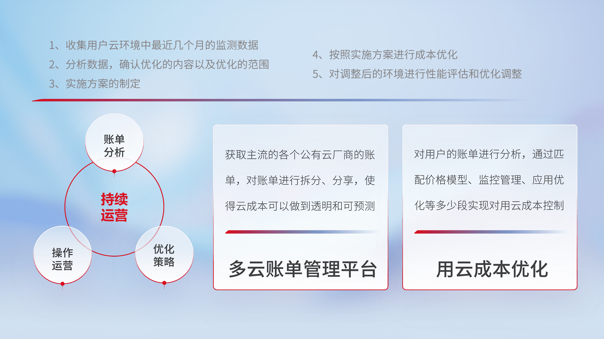 通过多云纳管,,,,以统一的资源数据模型把客户的云资源进行抽象和封装,,,进而实现对多云资源的统一操作,,,保障云资源管理的可靠性、、、稳定性与可用性。。。。量身定制化运维内容,,,,配置、、开发运维、、、补丁管理、、、、备份、、、、监控、、认证和访问管理、、、、审计和日常巡检等,,保障在用云过程中的可靠度,,稳定度以及高可用率。。